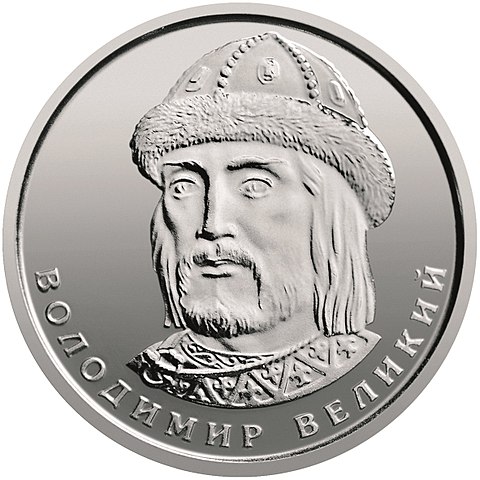 Ukrainian 1 hryvnia coin of 2018 series, reverse. Here is depicted Vladimir the Great, the Grand Prince of Kiev. Steel with galvanic coating, 18.9 mm in diameter, weights 3.3 g, reeded edge.