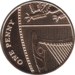 The British decimal one penny (1p) coin is a unit of currency and denomination of sterling coinage worth one-hundredth of one pound. Its obverse has featured the profile of Queen Elizabeth II since the coin introduction on 15 February 1971, the day British currency was decimalised. Four different portraits of the Queen have been used on the obverse; the latest design by Jody Clark was introduced in 2015. The second and current reverse, designed by Matthew Dent, features a segment of the Royal Shield and was introduced in 2008.The penny is the lowest value coin (in real terms) ever to circulate in the United Kingdom.