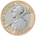The British two pound (£2) coin is a denomination of sterling coinage. Its obverse has featured the profile of Queen Elizabeth II since the coin introduction. Three different portraits of the Queen have been used, with the current design by Jody Clark being introduced in 2015. The reverse design features Britannia.