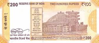 The 200 denomination banknotes in the Mahatma Gandhi (New) Series bear signature of the Governor, Reserve Bank of India. The note has motif of "Sanchi Stupa" on the reverse, depicting the country cultural heritage. The base colour of the note is bright yellow.